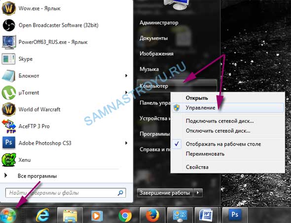 Открываем «Пуск» , кликаем ПКМ по «Компьютер» и нажимаем свойства, далее «Управление» .
