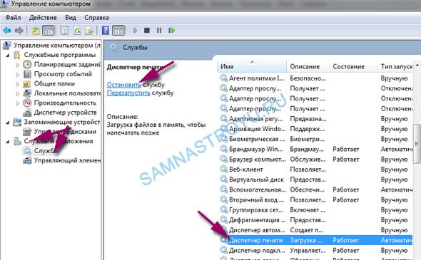 Теперь заходим в «Службы и приложения» —> «Службы» —> «Диспетчер печати» —> «Остановить» .