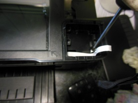 Прежде чем снять мешающую деталь, необходимо отсоединить идущий к ней шлейф, который расположен под защитной крышкой с правой стороны снаружи каретки. Отгибать защелку, расположенную в нижней части, лучше просовывая кончик инструмента в щель с правой стороны. Так будет удобнее подтолкнуть крышку, имеющую три направляющих выступа (два вверху и один справа), влево и вниз, чтобы освободить ее из пазов. Теперь есть доступ к двум шлейфам: отсоединять необходимо нижний, именно он ведет к контактной плате. Подсовываем под него плоскую отвертку и осторожно вытаскиваем, стараясь, чтобы не было перекоса, и контакты извлекались одновременно.