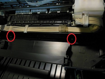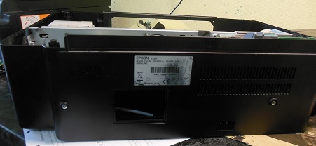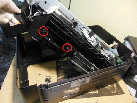 Если все-таки нащупать отверстия с защелками на задней стенке каретки вслепую никак не получается, да и проволоки для приспособления нет, можно пойти более длинным путем и снять корпус принтера Epson. Затем поворачиваем устройство и смотрим на конструкцию стальной перегородки сзади: с обеих сторон поближе к краям есть небольшие окошки. Если сдвинуть каретку до отказа вправо, через отверстие будет видна правая защелка. Она легко отжимается простым надавливанием отвертки. Аналогичным образом в окошке слева будет видна другая защелка, если передвинуть каретку до отказа в эту сторону.