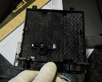 - На тыльной стороне снятого принтера есть два винта, которыми крепится адсорбер. Откручиваем и теперь можно достать «пеленку», очистить принтер от пролитой краски и промыть или заменить адсорбер на новый (при необходимости).