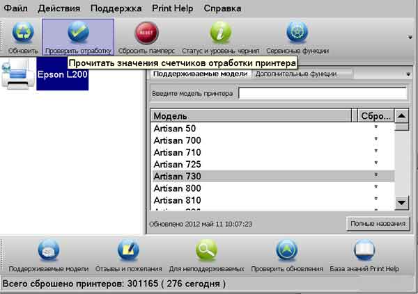 Запустите программу PrintHelp. В списке подключенных принтеров в левом окне выберите модель принтера, в которой вы хотите проверить и сбросить памперс. Нажмите Проверить отработку.