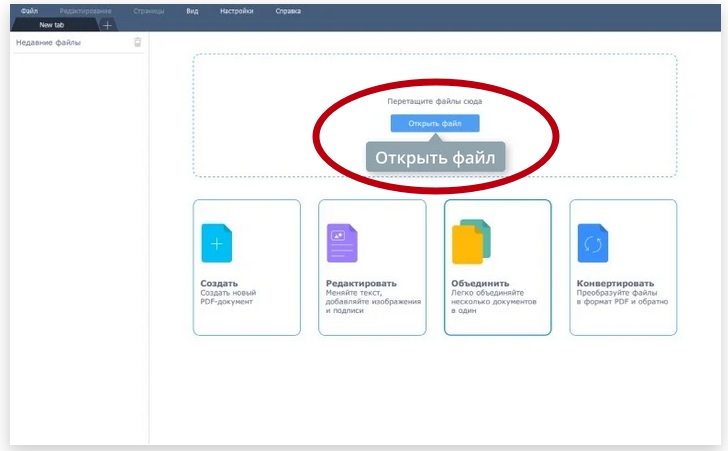 Откроется главное меню, в котором будет предложено несколько вариантов: открыть PDF, создать его с нуля, конвертировать его в другой формат или объединить несколько фрагментов в один файл. Если нужная бумага уже есть у вас в электронном виде — выбирайте первую опцию. Нужно будет указать путь к искомому файлу и нажать «Открыть».