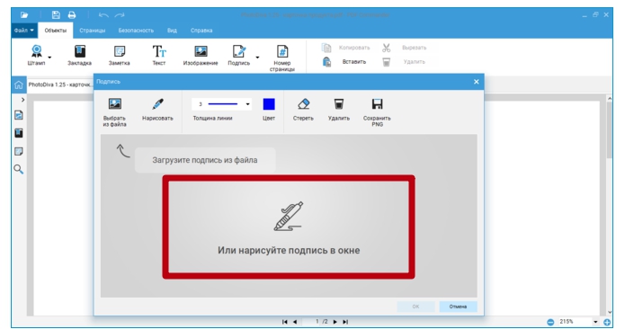 Хотите наложить подпись на документ, не распечатывая десятки листов? Легко! Найдите на верхней панели программы пункт с изображением бумаги и ручки, который называется «Подпись». Кликните по нему — откроется окно для рисования. Вы можете настроить толщину линии, цвет и сохранить автограф в формате PNG — чтобы использовать его в будущем.