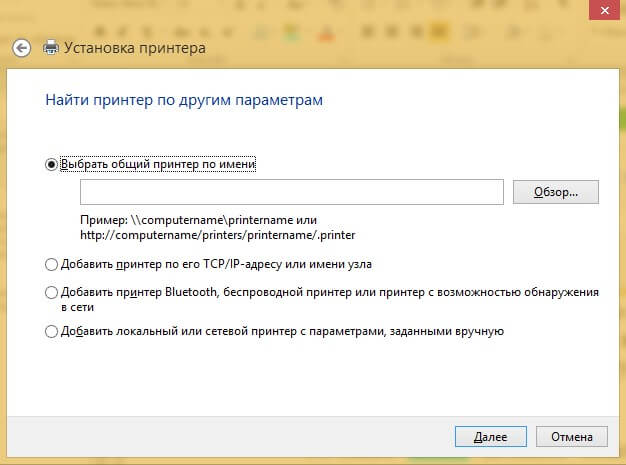 Далее следует найти принтер по другим параметрам. Например, можно выбрать принтер по имени, прописав вручную к нему путь. Либо нужно добавить сетевое устройство по IP-адресу или подключить беспроводное соединение HP deskjet по WiFi и Bluetuth.