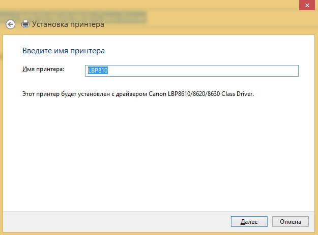 . - Нажмите «Далее» и задайте имя принтера, к примеру, lbp 810.