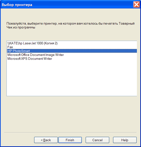Нажав кнопку Далее, вы попадете в следующее окно мастера настройки, где вам предложат указать, на каком именно принтере вы хотели бы печатать товарный чек. Укажите нужный принтер и нажмите кнопку Готово:
