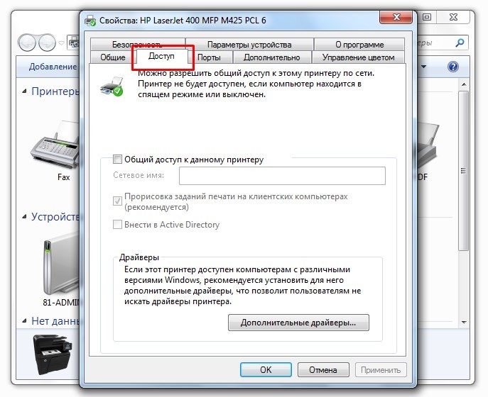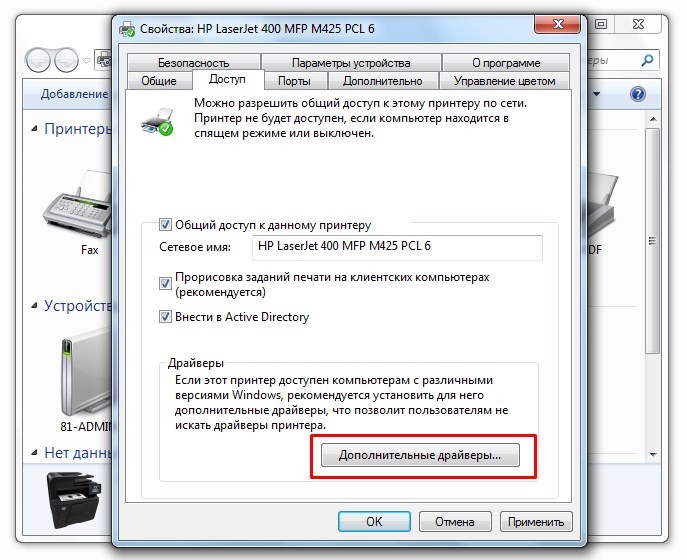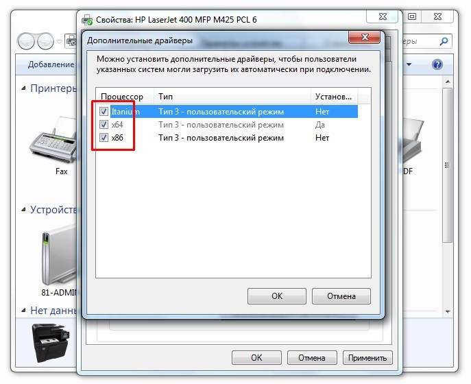 В окне “Дополнительные драйверы” необходимо отметить все галочки (при условии, что установлены драйверы для x86, x64 и т.д. устройств). Это позволит устанавливать драйверы к принтеру по сети не только для 32-битных ПК, но и для 64-битных: