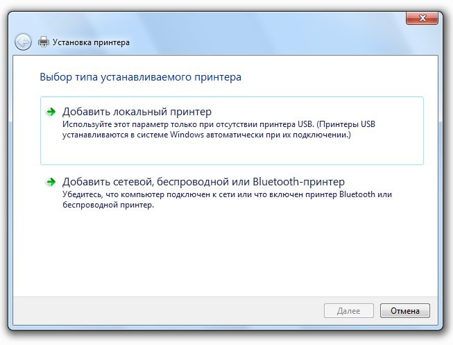 В появившемся окне увидим два пункта: “Добавить локальный принтер” и “Добавить сетевой, беспроводной или Bluetooth-принтер“: