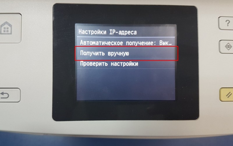 В меню устройства нужно задать ему статический IP-адрес. Это желательно сделать даже в том случае, если на вашем роутере настроена служба DHCP. Дело в том, что если IP-адрес принтера будет постоянно меняться, это осложнит его поиск и он периодически будет пропадать из списка доступных устройств. Есть конечно вариант зарезервировать IP адрес в настройках DHCP сервера по MAC-адресу.