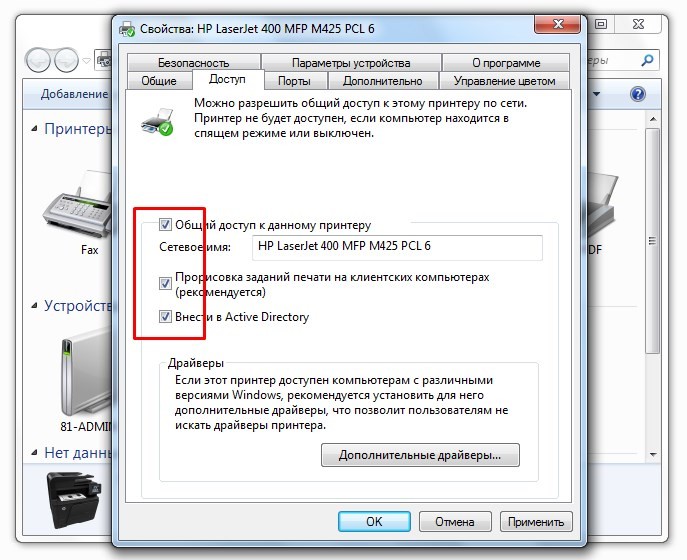 Что мы тут видем, это неактивный пункт “Общий доступ к данному принтеру“. Необходимо поставить галочку в этом пункте. Подобные манипуляции позволять теперь нам найти принтер по ip адресу или DNS имени компьютера. Но не торопитесь нажимать “ОК“, следует еще поставить галочку в пункте с названием “Внести в Active Directory” (Если у вас доменная машина, это упростит поиск принтера)
