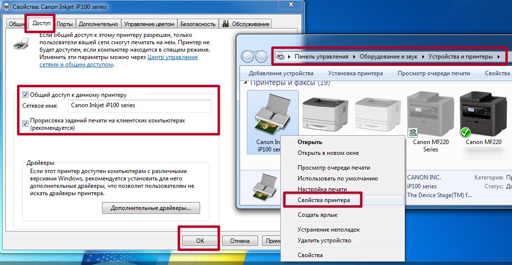 После клика по ярлыку МФУ выбирают блок «свойства принтера», переходят в «доступ» и устанавливают разрешение на общий доступ для всех пользователей. После завершения любой человек с доступом может подключиться и распечатать необходимую документацию.