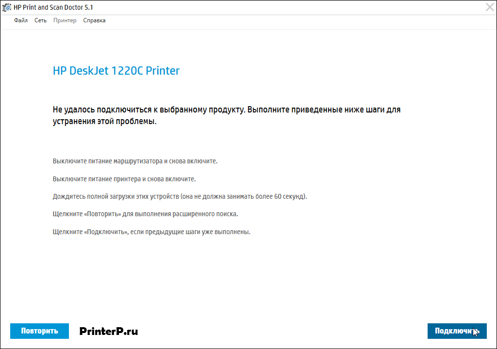 - Теперь следуйте соответствующим инструкциям на экране, прежде чем нажимать «Повторить». В конечном итоге ваш принтер HP должен появиться в списке.