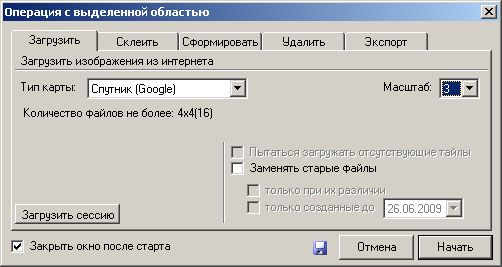 - В открывшемся окошке убеждаемся в правильных настройках и жмем Начать. По завершении жмем «Выход». Масштаб карты можно увидеть слева наверху. Чем больше масштаб, тем дольше будет загружатся и склеиваться изображение.