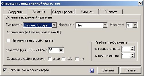 - На вкладке склеить указываем формат, путь сохранения и масштаб в котором вы скачивали тайлы, начать