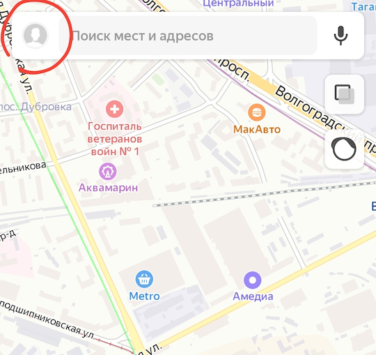 К счастью, Яндекс Карты дают возможность работать офлайн, закешировав определенную область. Делается это следующим образом. Открыв приложение Яндекс Карты нажмите на значок со своим аватаром или гамбургера возле строки поиска.