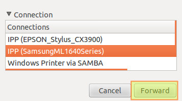 2) Внизу мы увидим имена доступных принтеров. Давайте выберем принтер Samsung и нажмем кнопку «Forward» (Далее):