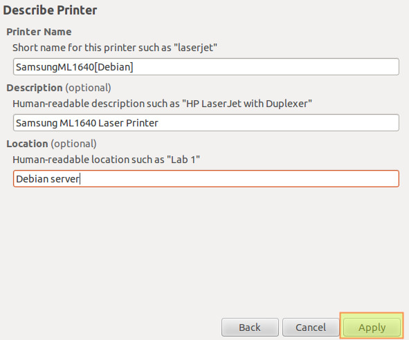 3) Нам будет предложено добавить некоторую информацию о нашем принтере. По окончанию мы нажимаем кнопку «Apply» (Применить):