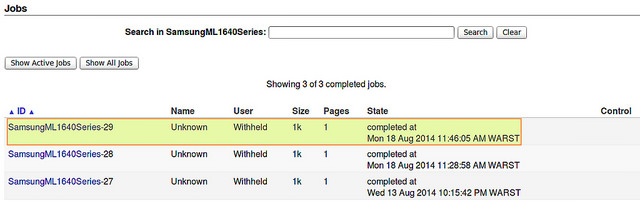 5) С помощью веб-интерфейса пакета CUPS мы можем увидеть, что задание печать было успешно принято. Используйте Printers -> SamsungML1640Series -> Show completed jobs (Принтеры -> Серия SamsungML1640 -> Показать завершенные задания):