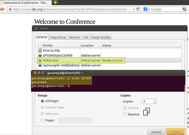 Печать из Ubuntu 12.04 пользователя, вошедшего в систему как gacanepa (на сервере принтера существует учетная запись с таким же именем).