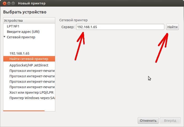 Подключение принтера по сети, на компьютере-клиенте. Выполняется через стандартный GUI интерфейс, для GNOME это апплет «Печать» (Printing). Нажимаете кнопку добавить принтер, затем в диалоговом окне выбираете «Найти сетевой принтер», вводите IP адрес компьютера-сервера и нажимаете кнопку «Найти»: