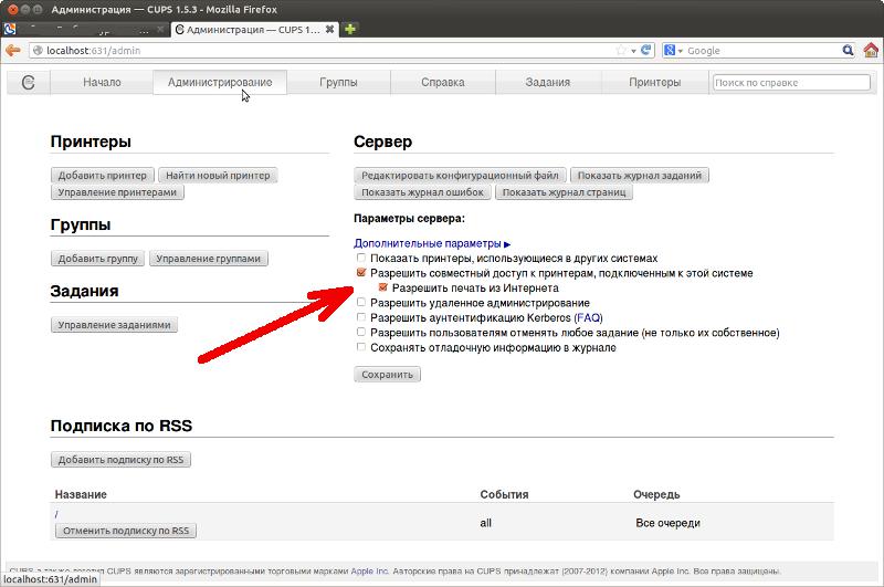 В Linux печатью управляет служба CUPS. В Ubuntu, доступ к настройкам службы CUPS возможен через любой браузер — нужно открыть адрес «localhost:631» и в панели, на вкладке «Администрирование» включить опции «Разрешить совместный доступ ..», «Разрешить печать из Интернета»: