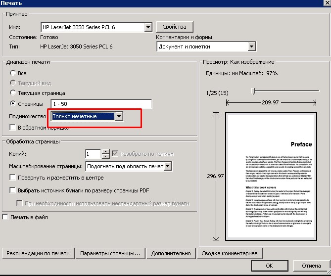 - Выбрать «Напечатать все страницы», а внизу найти и щелкнуть «Напечатать только нечетные страницы» и отправить их на печать.