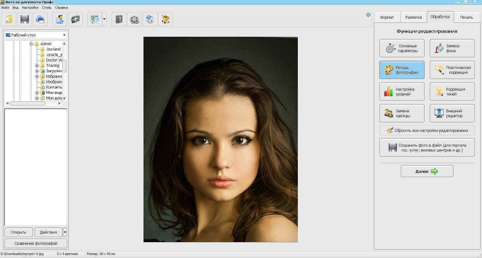 6. Теперь вы можете редактировать фото: ретушировать лицо, переодеваться, корректировать различные эффекты. Когда фотография будет отредактирована, нажмите Далее.