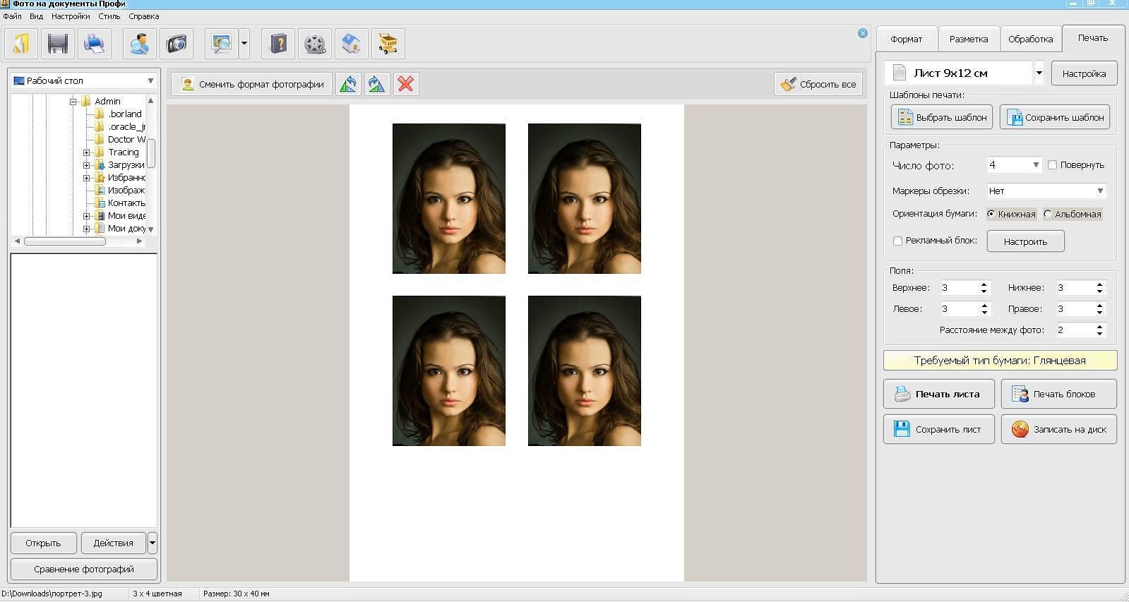 Думаю с этим разобрались. На этом пол дела сделано. Теперь нужно открыть полученное фото в программе Фотошоп, подкорректировать яркость, исправить дефекты (прыщи, царапины) на лице, установить необходимый размер и отправить на печать, если есть в наличии фотопринтер. Или же сохранить на флешку и распечатать в ближайщем фотосалоне, но уже по цене стандартной фотографии 10 на 15.