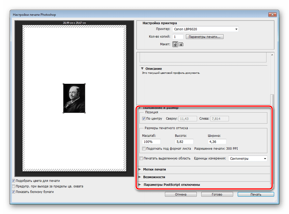 В этом окне обратите внимание на пункты «Высота», «Ширина» и «Разрешение». В моем случае я собираюсь сделать фото 3 на 4, соответственно ширину устанавливаю — 3 сантиметра и высоту — 4. А разрешение в строгом порядке 300 пикселей/дюйм независимо от размеров фото.