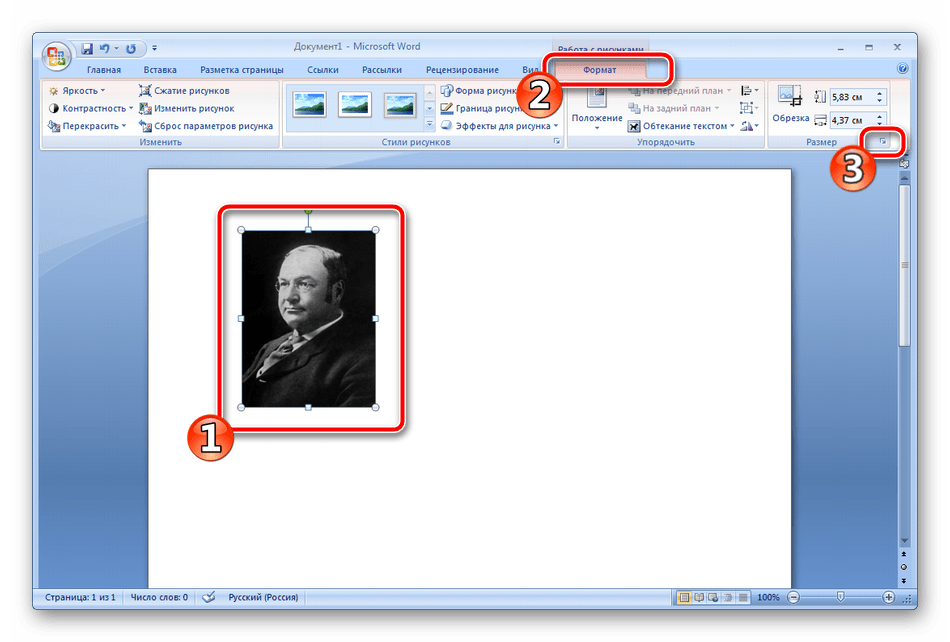 6. Для этого нужно нажать на него мышкой два раза и перейти во вкладку «Формат», где требуется открыть дополнительные настройки размера.
