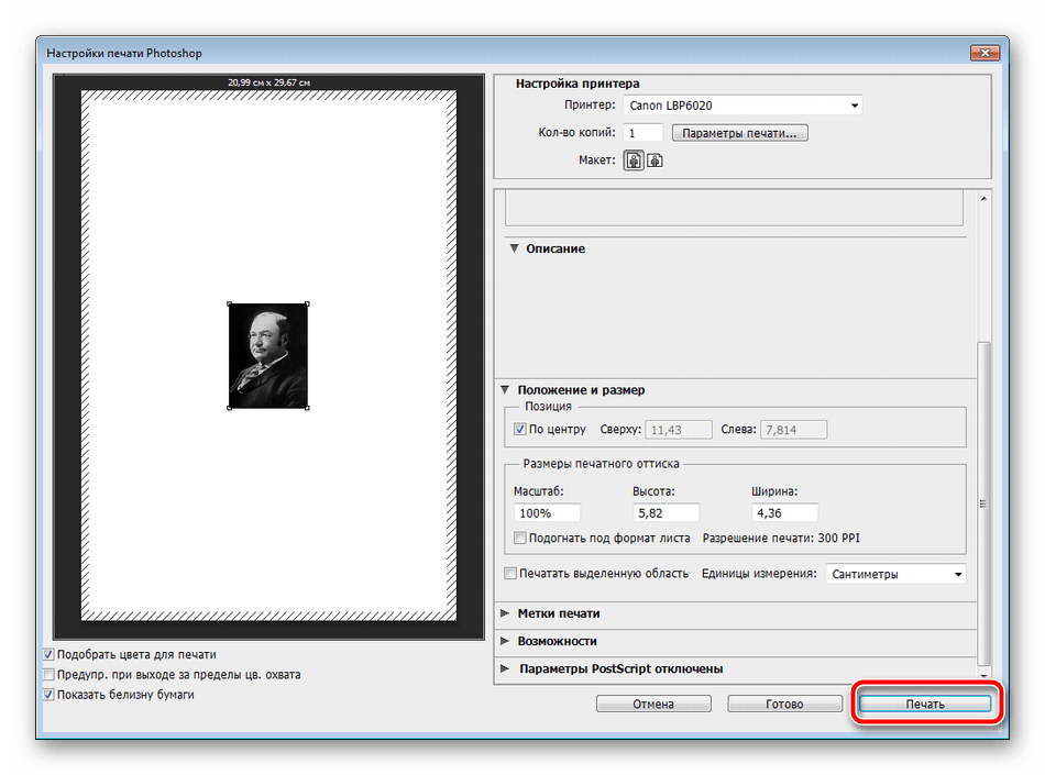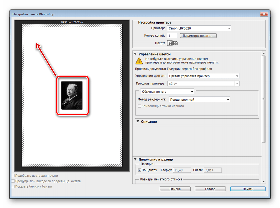 На скриншоте выше видно, что масштаб фото больше чем размеры 3 на 4. Подгоняем его под наши размеры, уменьшив его с угловых точек рамки зажав клавишу Shift (чтобы сохранить пропорции). Получаем примерно следующее.