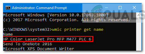 - В командной строке с повышенными привилегиями введите или вставьте следующую команду и нажмите Enter, чтобы увидеть список со всеми вашими принтерами, которые в настоящее время активны: wmic printer get name