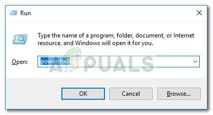 - Нажмите клавишу Windows + R , чтобы открыть окно «Выполнить». Затем введите « PowerShell », нажмите Ctrl + Shift + Enter и нажмите Да в Запрос управления учетными записями пользователей , чтобы открыть окно Powershell с повышенными привилегиями.