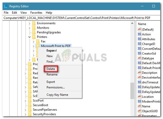 Некоторым пользователям удалось окончательно удалить принтер со своего компьютера после удаления всех ключей и подключей, принадлежащих неисправному принтеру, с помощью редактора реестра. .