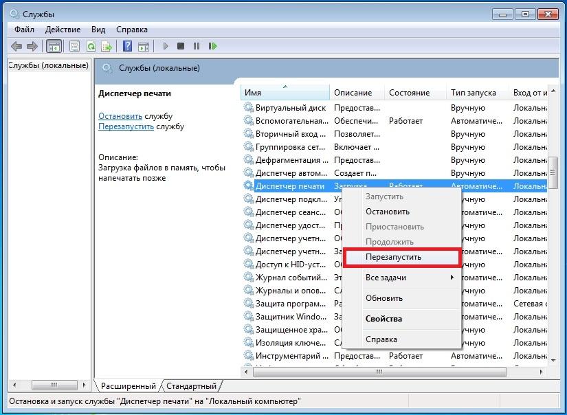 Теперь нам нужно зайти в надстройку «Службы». Для этого в программе «Выполнить» мы используем следующую команду: Services.msc Также эту надстройку можно найти в Панели управления в разделе администратора. В этой надстройке нам необходимо найти службу «Диспетчер печати». После этого кликнем по этой службе правой кнопкой мыши и выберем пункт «Перезапустить».