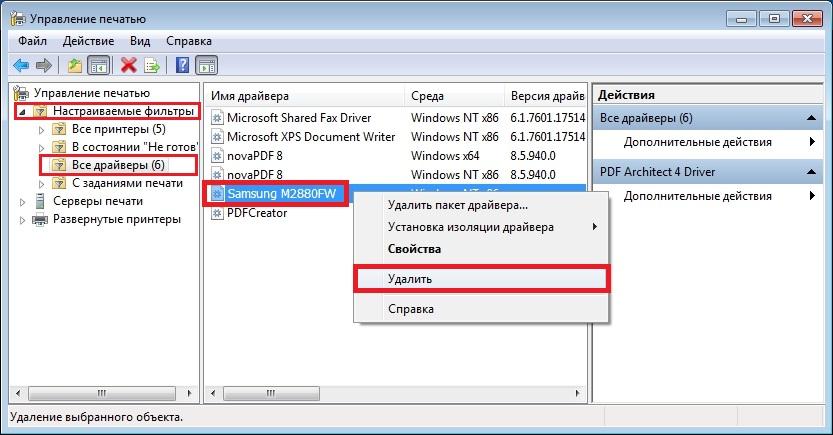 В открывшемся окне находим драйвер, относящийся к МФУ Samsung M2880FW и удаляем его кнопкой Удалить . На этом наши действия еще не заканчиваются. Нам необходимо зайти в последнюю надстройку «Управление печатью». Для этого исполним такую команду: printmanagement.msc в программе «Выполнить». В открывшейся надстройке перейдите к разделам «Настраиваемые фильтры / Все драйвера» После этого найдем из списка на наш принтер и удалим его.