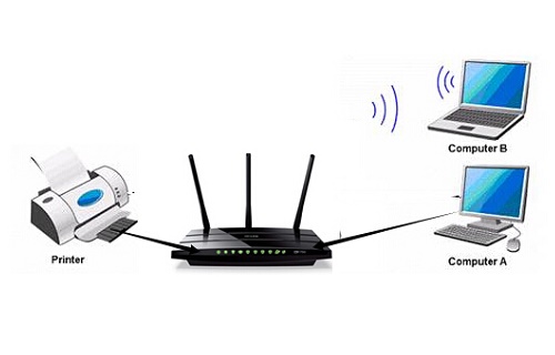 Чаще всего эта схема применяется в офисах, но при необходимости, возможно, её применение и для домашней сети. К достоинствам такого подключения можно также отнести возможность использования устройства печати через WiFi без наличия беспроводного адаптера на самом аппарате. Это означает, что если у вас дома есть ноутбук, его не обязательно соединять через кабель. Файлы можно отправить на печать через беспроводную сеть.
