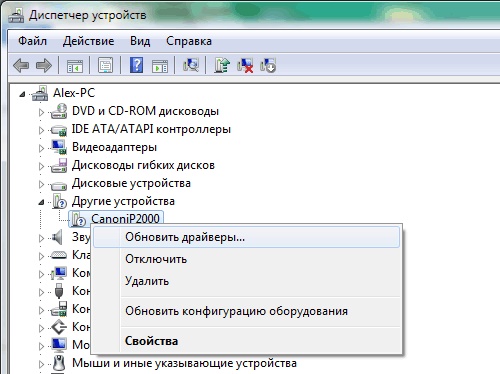 Также можно добавить оборудование в ручном режиме. Для этого кликните ссылку «Принтер отсутствует в списке» и укажите требуемые параметры. Обновить драйверы подключенного девайса можно и в диспетчере устройств. Он также открывается через панель управления Windows. Неопознанное оборудование будет отображаться в разделе «Другие устройства». Чтобы обновить программное обеспечение, которое требуется для взаимодействия с ПК, выберите пункт меню «Обновить драйверы».