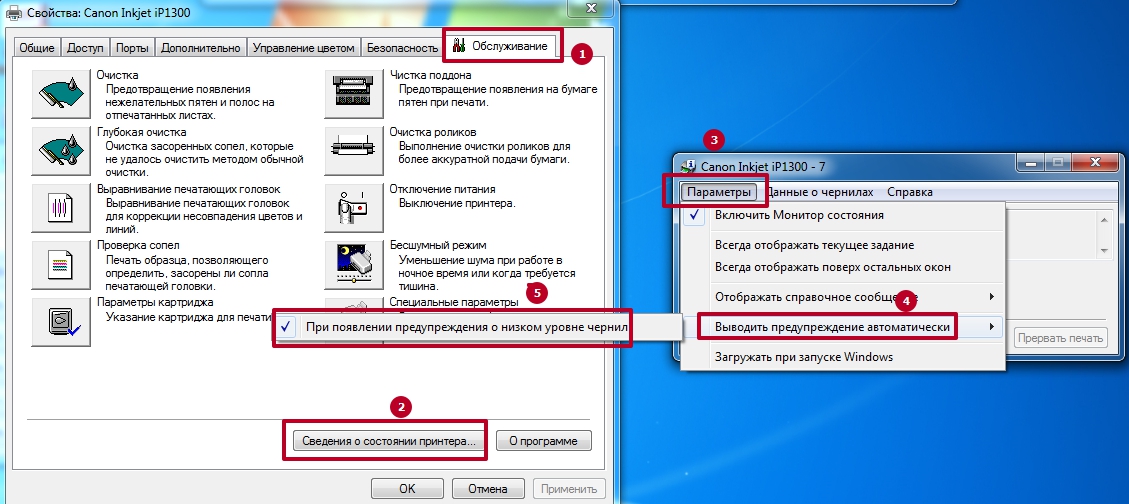 Если после заправки начало выскакивать окно с уведомлением о низком уровне чернил или ее отсутствии, то необходимо попросту отключить функцию слежения за количеством чернил в принтере. Для этого нужно выполнить такие действия: