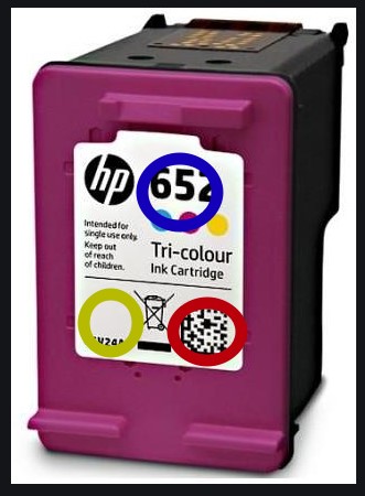 Заправка цветного картриджа HP 652 выполняется водными чернилами в отверстия, обозначенные на рисунке. В каждое отверстие заливается не более 3.5 мл. чернил соответствующего цвета. Нельзя допускать смешивания чернил и картридж заклеивать скотчем или изолентой во избежание смешивания цветов под действием капиллярных сил.