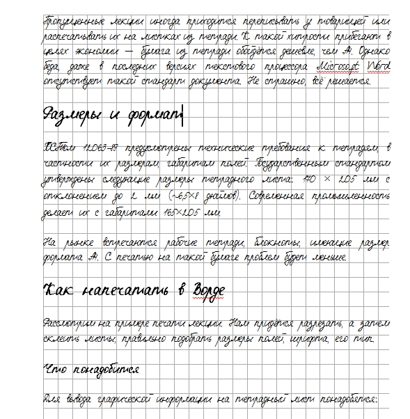 О размерах, формате и печати на тетрадном листе в Ворде конспекта рукописным шрифтом