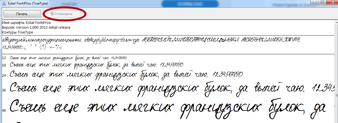 - Установите рукописный шрифт Eskal или ему подобный (скачайте, запустите файл формата ttf, нажмите «Установить»).