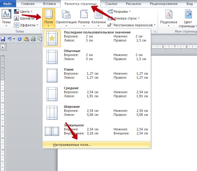 - Во вкладке «Макет» щёлкните по кнопке «Поля», в выпадающем списке – по «Настраиваемые…».