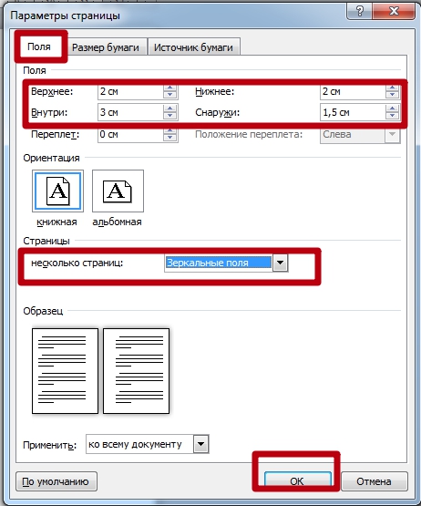 Значение параметра «Несколько страниц» выберите как «Зеркальные поля». Опция отвечает за печатание полей то с левой, то с правой стороны поочерёдно. Ориентация – «Книжная», не изменяйте.
