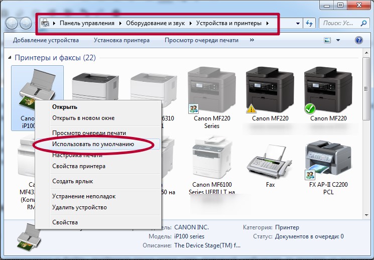 Перейдите Панель управления — Оборудование и звук — Устройства и принтеры . Наведите курсор на необходимую модель принтера, а затем установите его по умолчанию, открыв контекстное меню правой кнопкой мыши.