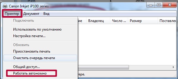 Также нелишним будет проверить наличие зависания документов в очереди печати и статус автономной работы. Для этого в контекстном меню выберите «Просмотр очереди», а потом меню «Принтер» в новом окне.