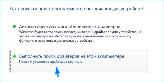 На экране выбора способа обновления перейдите на второй вариант (поиск на этом компьютере).