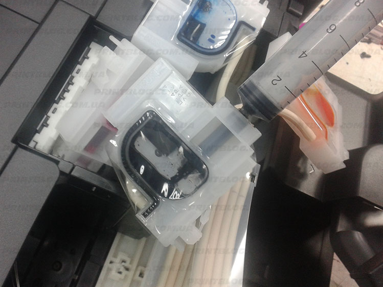 Вставляем шприц в слегка наклонный выпускной патрубок демпфера и извлекаем чернила до тех пор, пока демпфер не заполнится чернилами, не забывая установить зажим чернильного шлейфа в рабочее положение…