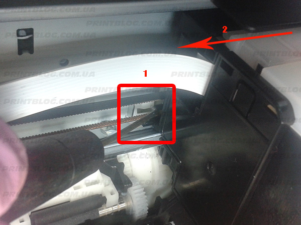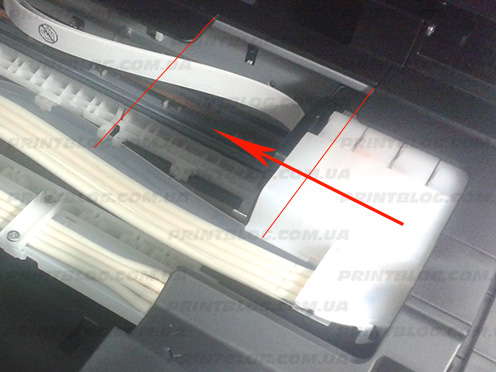 - Отключаем питание. Вытаскиваем шнур питания из принтера. Это нужно сделать так, чтобы каретка с патронами или демпфирующими камерами свободно перемещалась по направляющим.